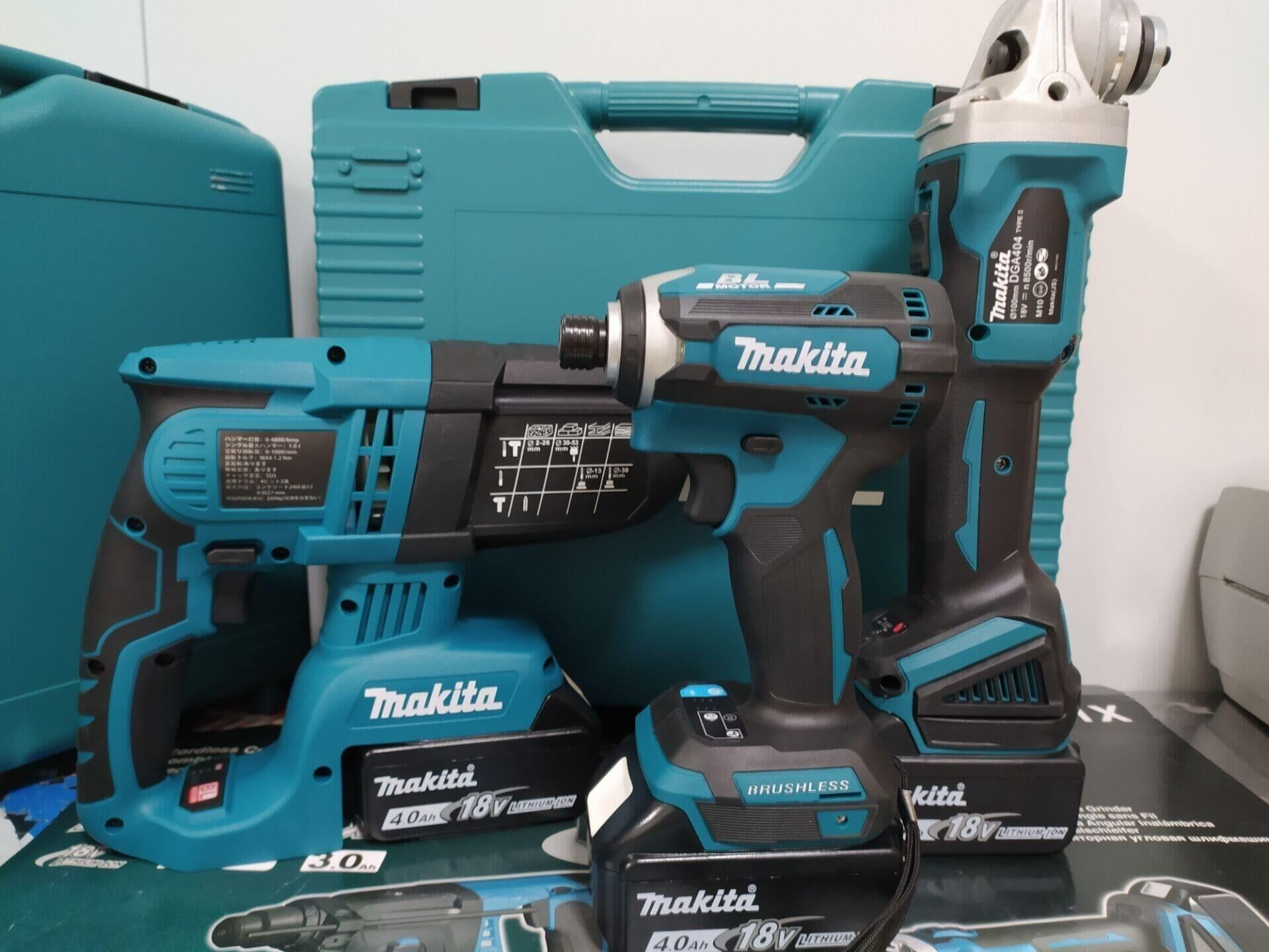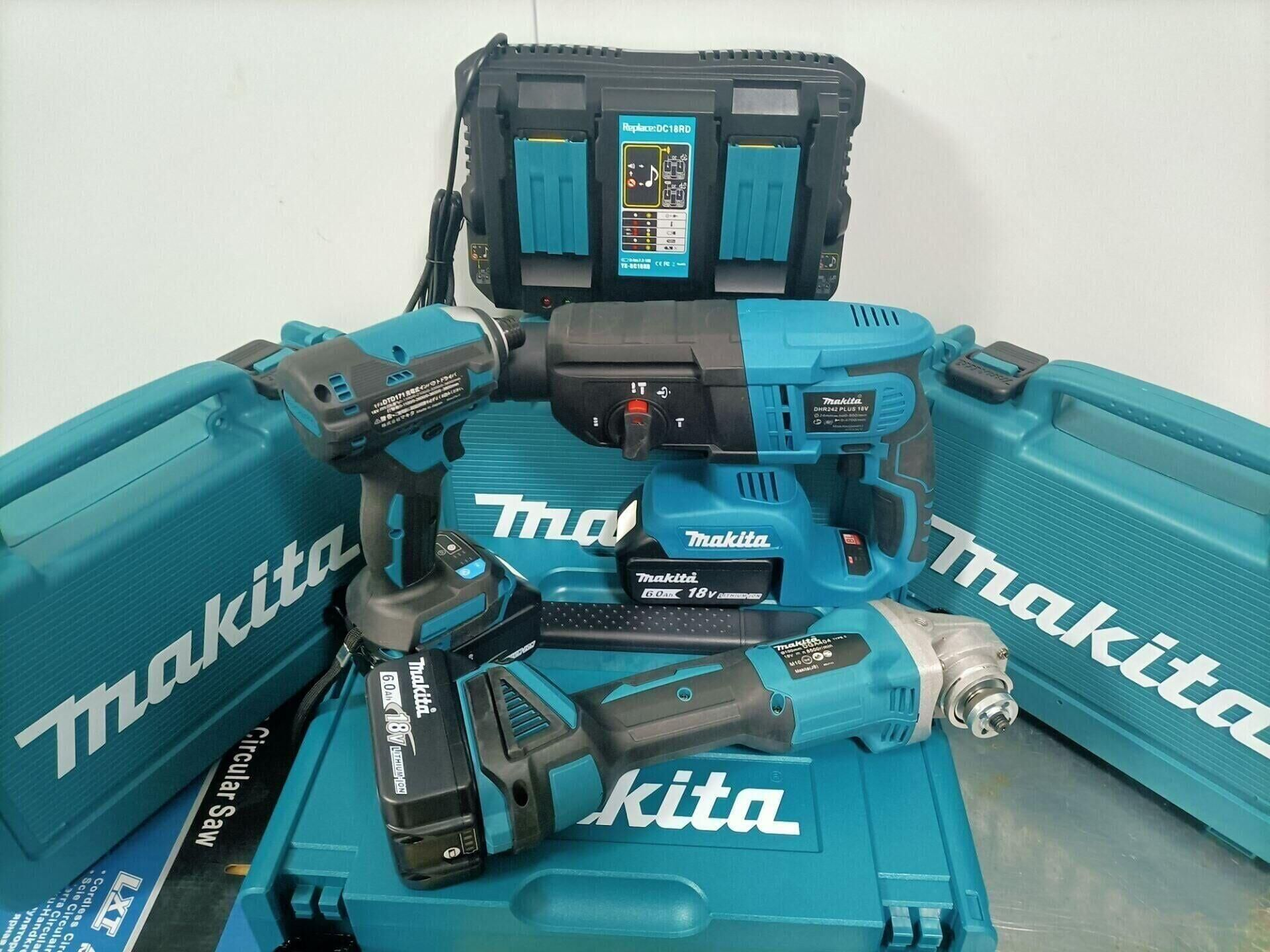 半小時前makita牧田款18V無刷牧田三機組!限時搶購中,每人限購一組 - 牧田三機組鎚鑽+砂輪機+起子機(三主機+原廠18V6.0電池*6顆+充電器*6)一入組NT$8580