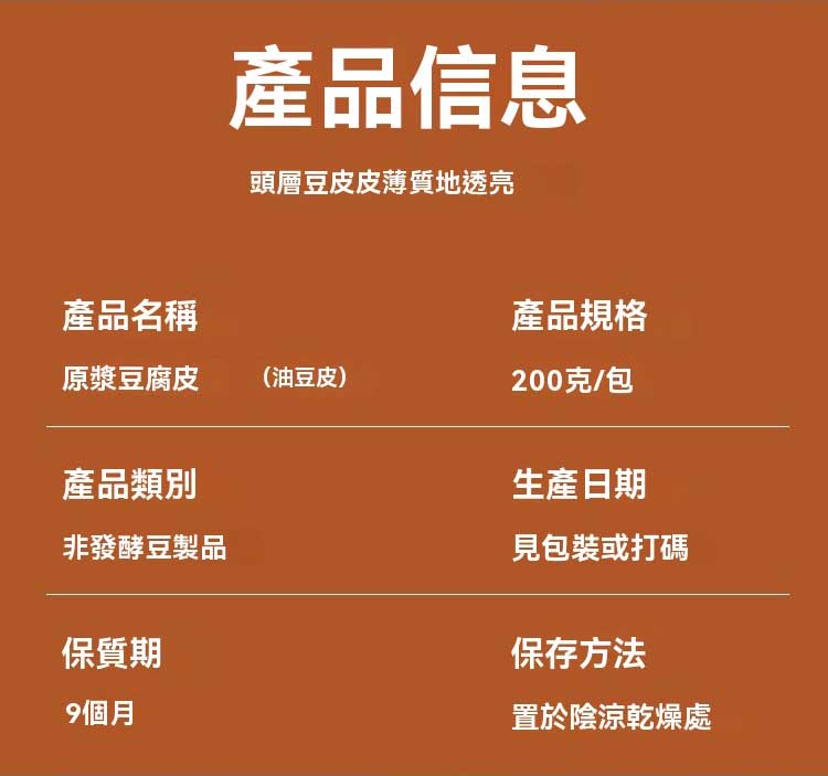 2分鐘前【正宗頭層手工蟬翼豆腐皮】採用高山有機大豆,手工製作的頭層豆皮,薄如蟬翼,做春卷,響鈴,涼拌菜等,多種吃法,煮湯,炒菜都可以。 - 【頭層豆腐皮 薄如蟬翼】3入組(約150張)NT$1298