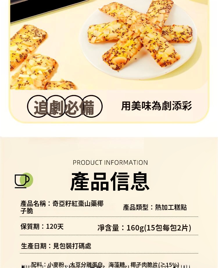 半小時前奇亞籽紅棗山藥椰子薄脆 - 【超值囤貨】買三送三 箱裝 NT$1398
